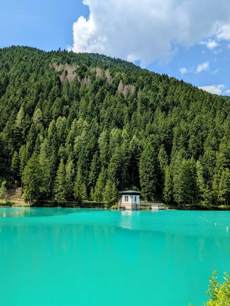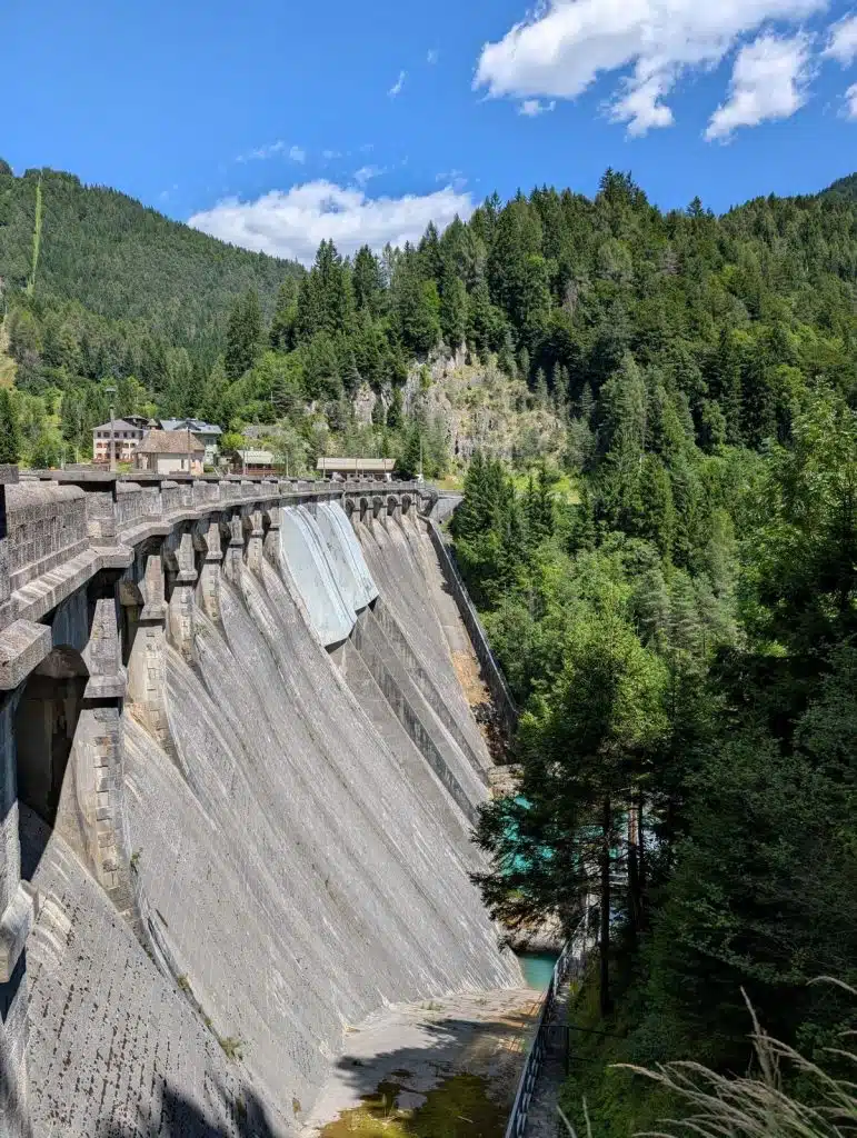 Ich weiß nicht, wie oft ich schon am Auronzo-See in der Region Cadore in Venetien gehalten habe. Die Anziehungskraft dieses Panoramas ist einfach unwiderstehlich – und das zu jeder Jahreszeit und bei jedem Wetter. Denn je nachdem, wie die Farben des Himmels changieren, verändern sich auch die Farben des Sees. An einem Ufer erstreckt sich die Hauptstraße, die sich durch die kleine Bergstadt schlängelt. Das andere Ufer ist dagegen wilder. Ein Schild weist auf einen Wanderweg hin. Die beiden Ufer sind durch einen Fußgänger- und Radweg miteinander verbunden. Genau darauf stehe ich heute bei Kaiserwetter, bewundere das Panorama und schieße unzählige Fotos. Der Auronzo-See ist kein natürlicher See. Er wird auch Lago di Santa Caterina genannt, weil auf ihn eine kleine Kirche aus dem Jahr 1554 blickt. Die Bauarbeiten für den Staudamm (Diga di Santa Caterina) begannen 1930 und zwei Jahre später ging er in Betrieb. Der 55 Meter hohe und zwischen 35 und 5,5 Meter breite Damm bietet ein beeindruckendes Schauspiel, wenn das Wasser fließt.