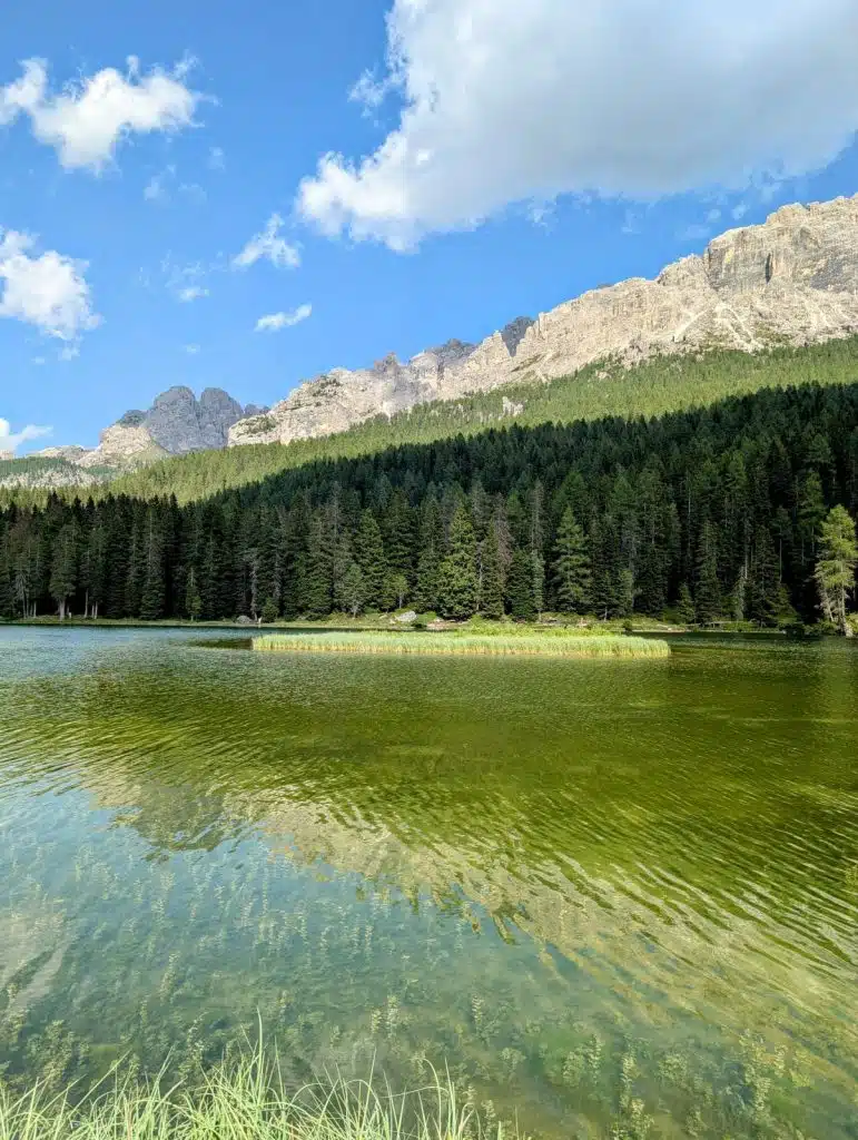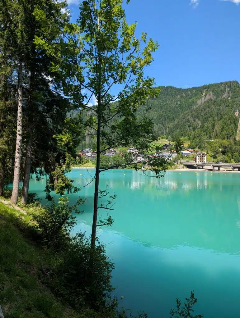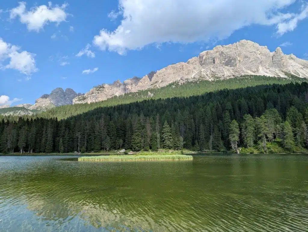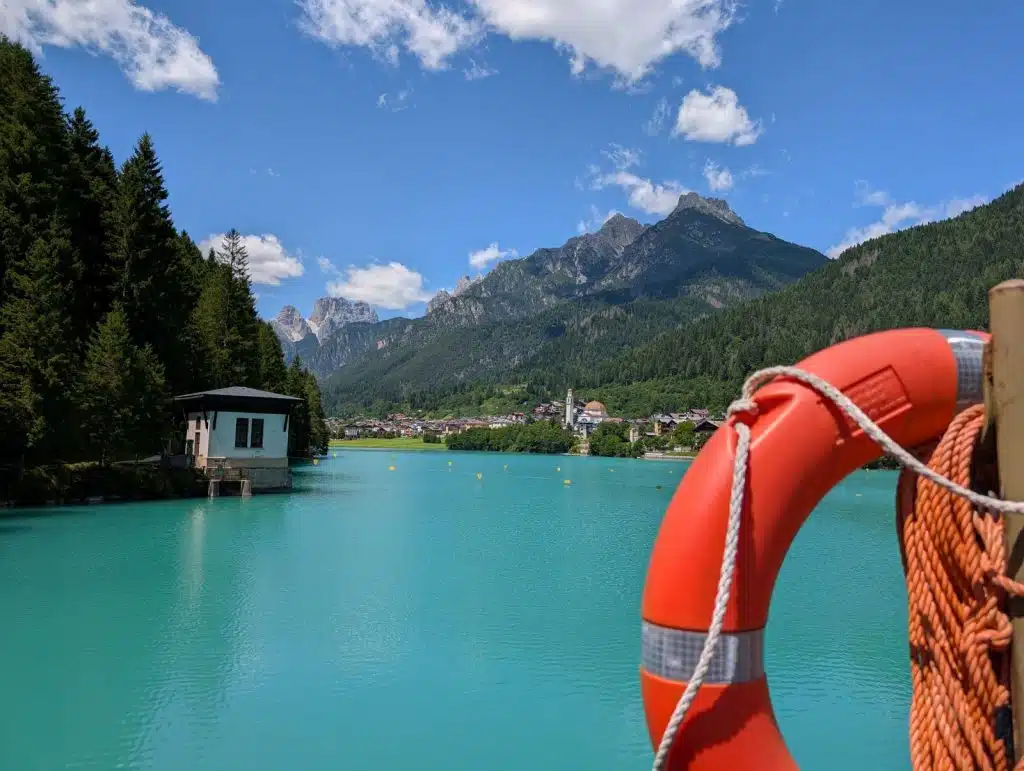 Am kleinen Parkplatz, auf dem man halten kann, erinnert eine alte, nostalgisch anmutende Seilbahnkabine daran, dass die Region Cadore in der Provinz Belluno mit ihren Dolomiten ein echtes Winterparadies ist. Es geht aber nicht nur um Auronzo, sondern auch um den Ortsteil Misurina, der wegen seines Sees sehr bekannt ist. Der Lago, sowohl im Winter, wenn er gefroren ist, als auch im Sommer, wenn er für Erfrischung sorgt, ist eine Attraktion. Deswegen bleibt Misurina immer einen Abstecher wert. Zwei großen weißen Statuen von Markuslöwen betonen am Auronzo-See, dass wir uns noch in der Region Venetien befinden. Es wird Zeit, meine Reise fortzusetzen. Das nächste Mal bleibe ich sicherlich länger. Noch ein letztes Bild, um die traumhafte Kulisse dieses Sees länger in Erinnerung zu behalten.