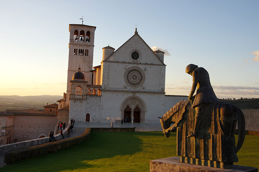 Wenn das Grün der Wiese vor der Basilika San Francesco in Assisi am Morgen von der Sonne beleuchtet wird, bringt es die helle Fassade der weltberühmten päpstlichen Basilika besonders zur Geltung: Jeder steht minutenlang staunend und wendet den Blick nur ungern wieder ab. Dieser Ort strahlt jedoch rund um die Uhr seine unwiderstehliche Faszination aus: Erstaunlich ist die Stimmung, wenn die untergehende Sonne den Himmel und die Wolken rosa und orange färbt und sogar magisch kommt die beleuchtete Basilika einem in der Nacht vor. Sie zieht jeden Besucher in ihren Bann auch in ihrem Inneren: in der Oberkirche mit erstaunlichen Fresken von Künstlern wie Giotto oder Cimabue; in der dusteren Unterkirche geht einem das Herz selbst beim Blick auf den sternbedeckten Himmel der Gewölbe auf.
