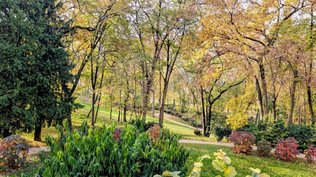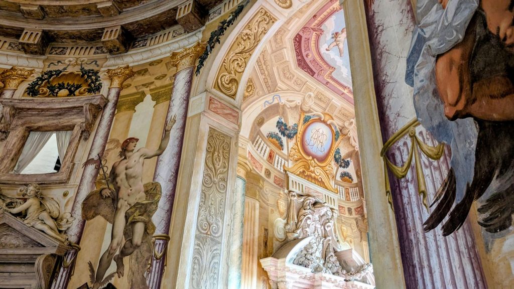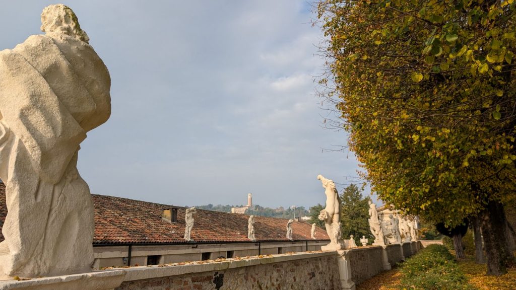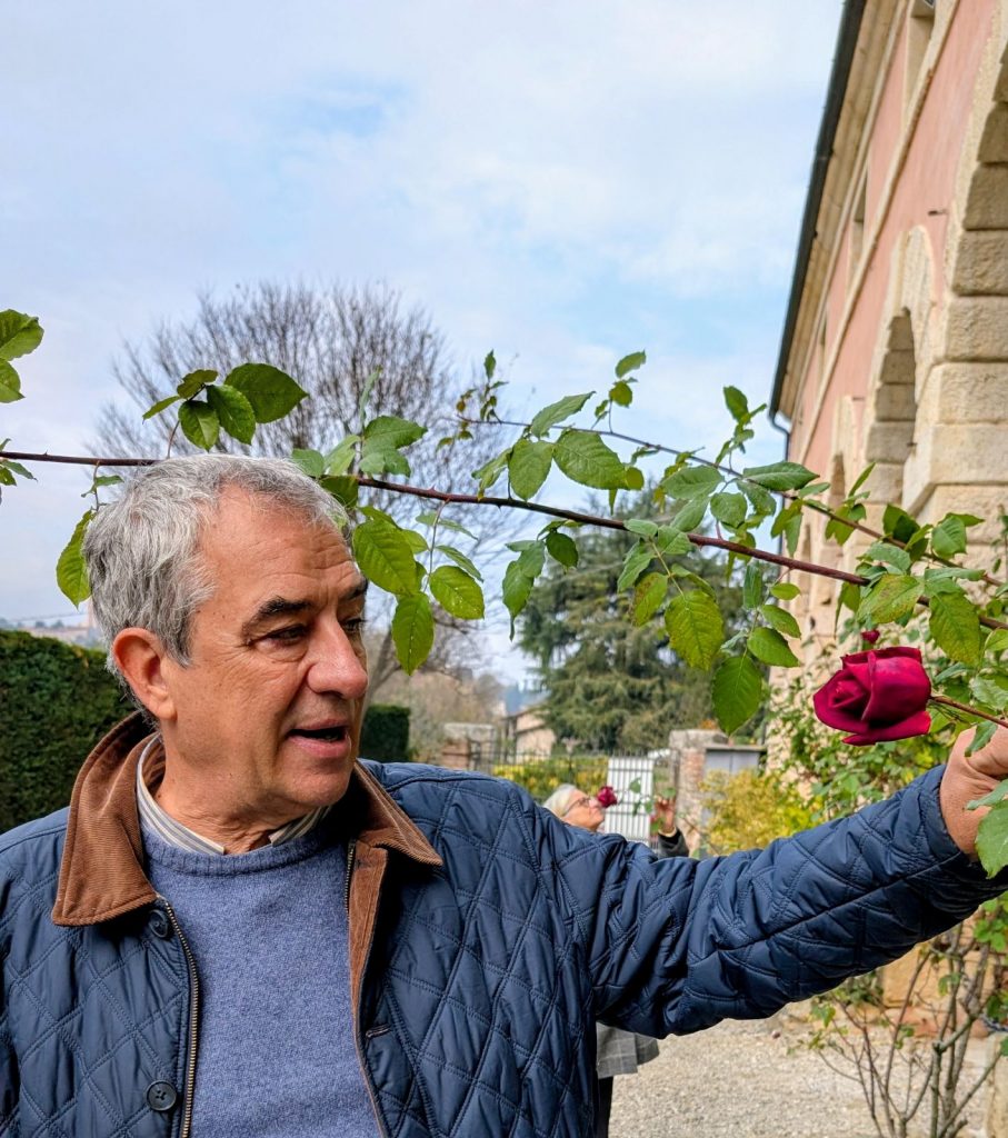 Die klassische Architektur fügt sich in die Landschaft ein, obwohl die Villa wie ein Palast wirkt. Die äußere pure Symmetrie setzt sich auch im Inneren fort: Vom Hauptsaal aus gehen vier Gänge ab. Doch der Innere ist mit prunkvollen, bunten Fresken von Alessandro Maganza, Louis Dorigny und Anselmo Canera verziert, die allegorische Figuren darstellen. „Palladio hätte das nie gewollt“, erklärt entschieden der Graf. Die Proportionen des Gebäudes, das Palladio nie vollenden konnte, scheinen sich auch im Boschetto Romantico, einem wunderschönen kleinen Wald, zu widerspiegeln. „Es wurden 580 Bäume und 60.000 Zwiebeln gezählt und rund 1200 Rosen gepflanzt“, sagt Nicolò Valmarana, der das Leben auf dem Land liebt und genießt, und riecht an einer roten Rose, die an einer Wand der Barchessa blüht. Wir werfen einen letzten Blick auf das faszinierende Gebäude, denn so viel Schönheit tut gut.