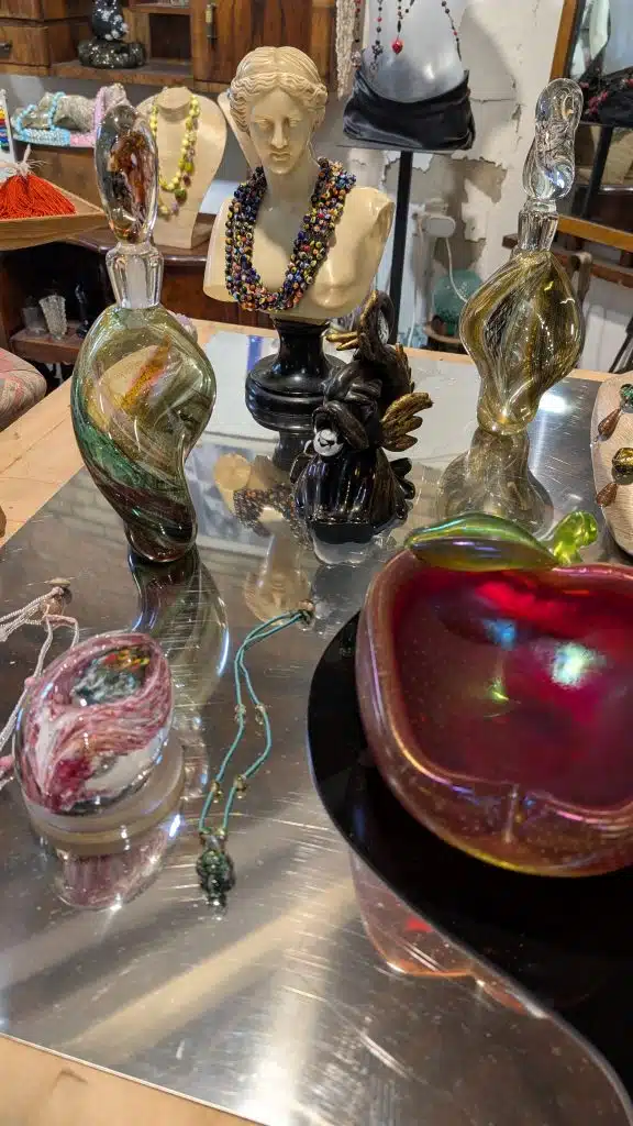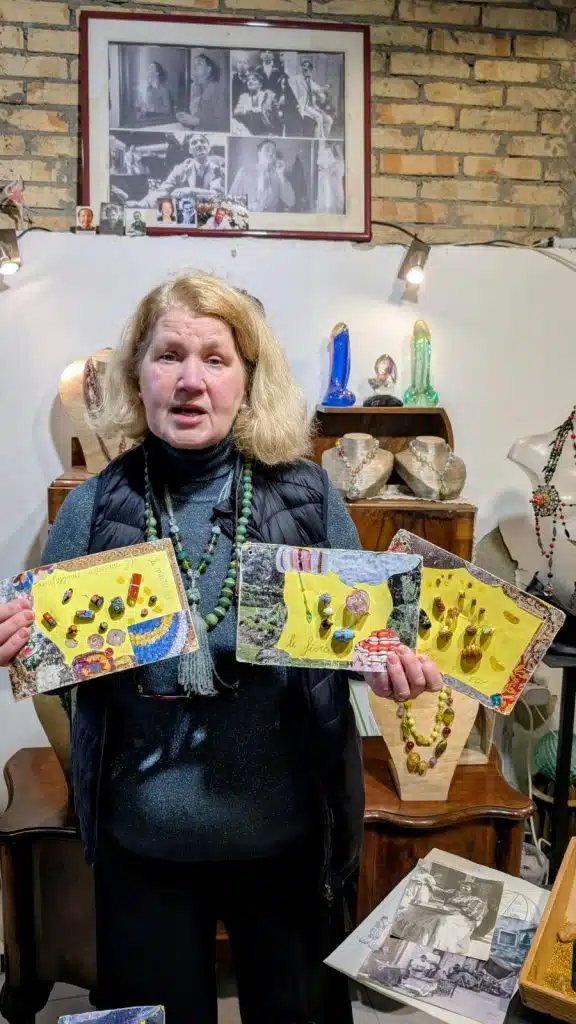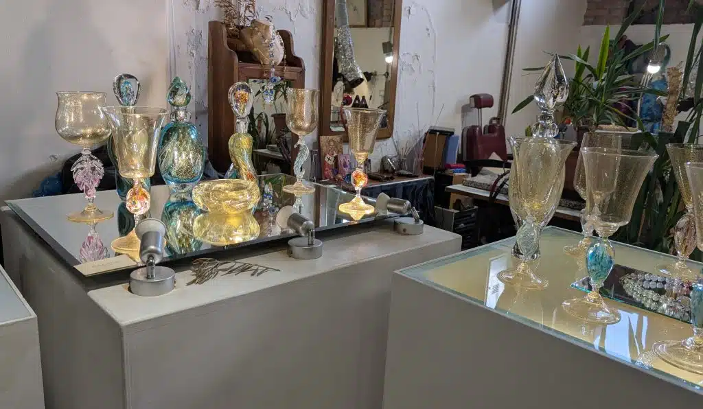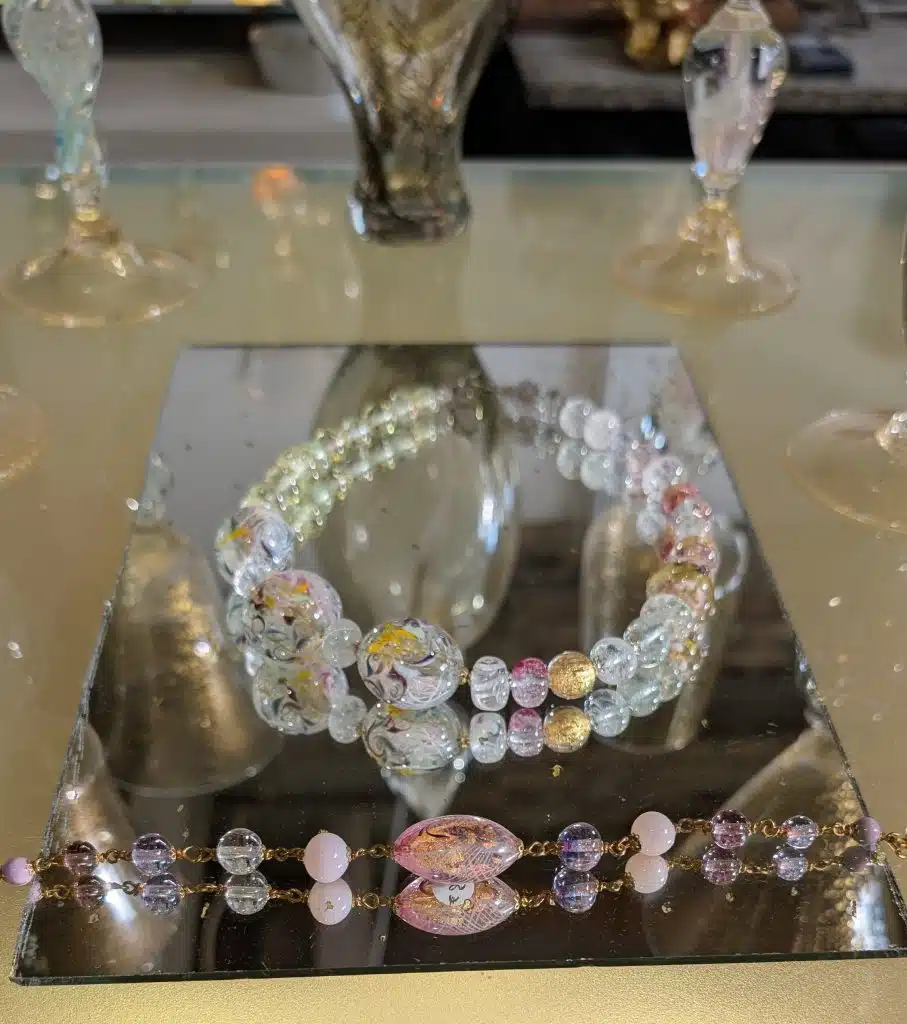 Anschließend sind es die Impareresse, die mit schnellen und präzisen Bewegungen die kleinen Perlen auffädeln und daraus Halsketten und andere Kunstgegenstände herstellen. 2008 verliebte sich die Französin Muriel in diese Kunst. Aus Liebe blieb sie auf der Insel in der Lagune. In den folgenden Jahren beobachtete und lernte sie viel und ist heute eine überzeugte Perlera. Ihr Atelier befindet sich in einer fast versteckten, authentischen Ecke von Murano. „In jeder Perle findet man die Seele der Person wieder, die sie gestaltet hat”, sagt sie uns und hält eine wunderschöne Perle hoch. Auf den Ausstellungstischen glitzern die Perlen in Form von Ketten und anderen Juwelen aus Glas. Es ist wichtig, dass es Menschen wie Muriel Balensi gibt, die diese historische Kunst weiterführen, denn die ersten schriftlichen Unterlagen dazu stammen sogar aus dem Jahr 983 n. Chr.