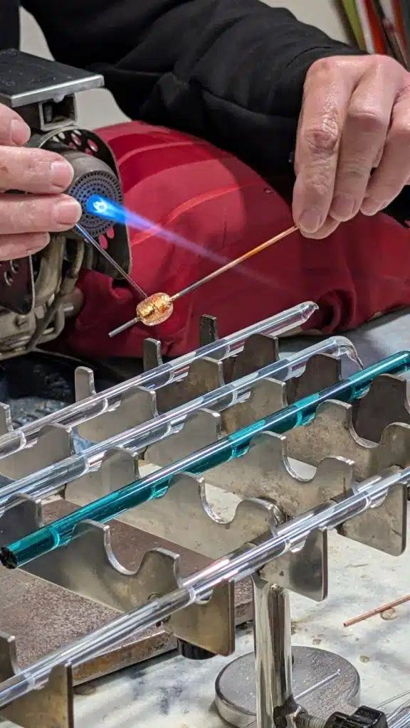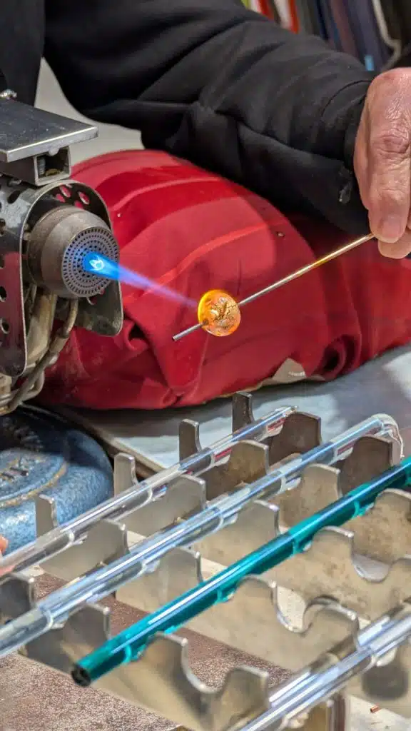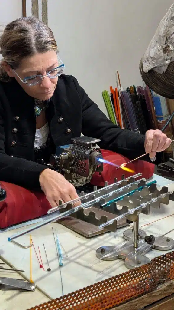 Konzentriert arbeitet Muriel mit der Flamme in ihrem Atelier auf der Insel Murano und zaubert aus einem Glasstab eine wunderschöne Perle aus Murano-Glas. Sie ist eine Perlera, eine Frau, die Glasstäbe im Feuer einer kleinen Flamme schmelzen, um Perlen herzustellen. Geschickt wickelt sie flüssiges Glas um eine Metallstange und bringt es in Form. Diese Art von Perlen wird „a lume“ oder „a vetro avvolto“ genannt.