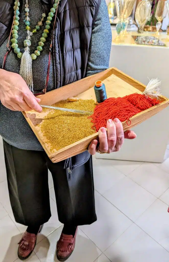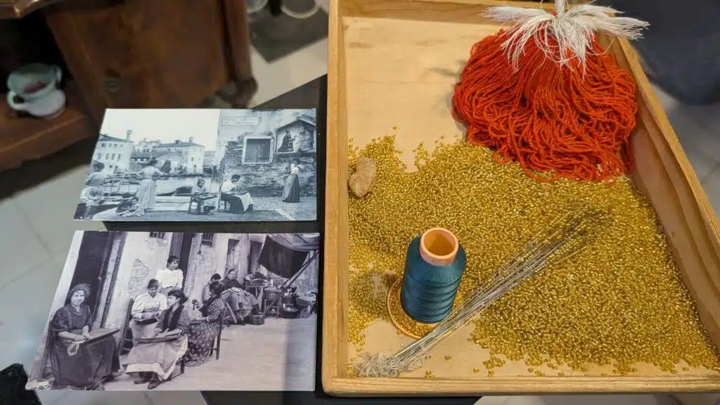 „Die Kunst der Glasperlen umfasst verschiedene Handwerke. Bevor die Perlera die Perlen gestalten kann, bereiten die Glasbläsermeister von Murano die Glasstange vor und die Schleifer die Zangen“, erzählt Marisa Convento. Sie ist eine erfahrene Impararessa und Vorstandsmitglied des Komitees „Comitato per la Salvaguardia dell’Arte delle Perle di Vetro Veneziane“. 2020 wurden die venezianischen Glasperlen in die Liste des immateriellen Kulturerbes der Menschheit der UNESCO aufgenommen. „Wir fügen uns als immaterielles Kulturgut in die UNESCO-Welterbestätte Venedig und seine Lagune ein“, fügt sie hinzu.