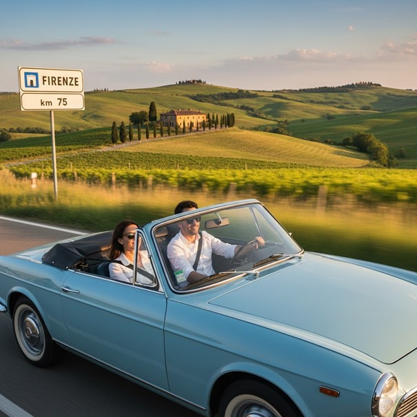 Bilder: Sylvia Pastres; Bild Auto in der Toskana: KI-generiert mit Google Gemini