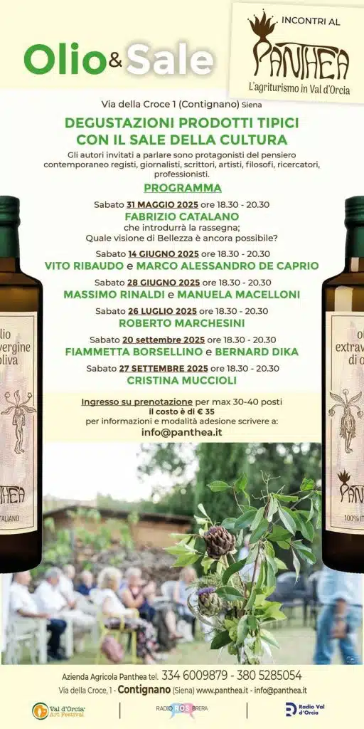 Olio & Sale: Unter diesem Titel findet von Ende Mai bis Ende September 2025 eine Reihe von kulturellen Veranstaltungen mit Verkostungen des Öls von Panthea statt, bei denen die Gäste auch Bruschetta mit einem Glas Wein genießen können. Programm hier.